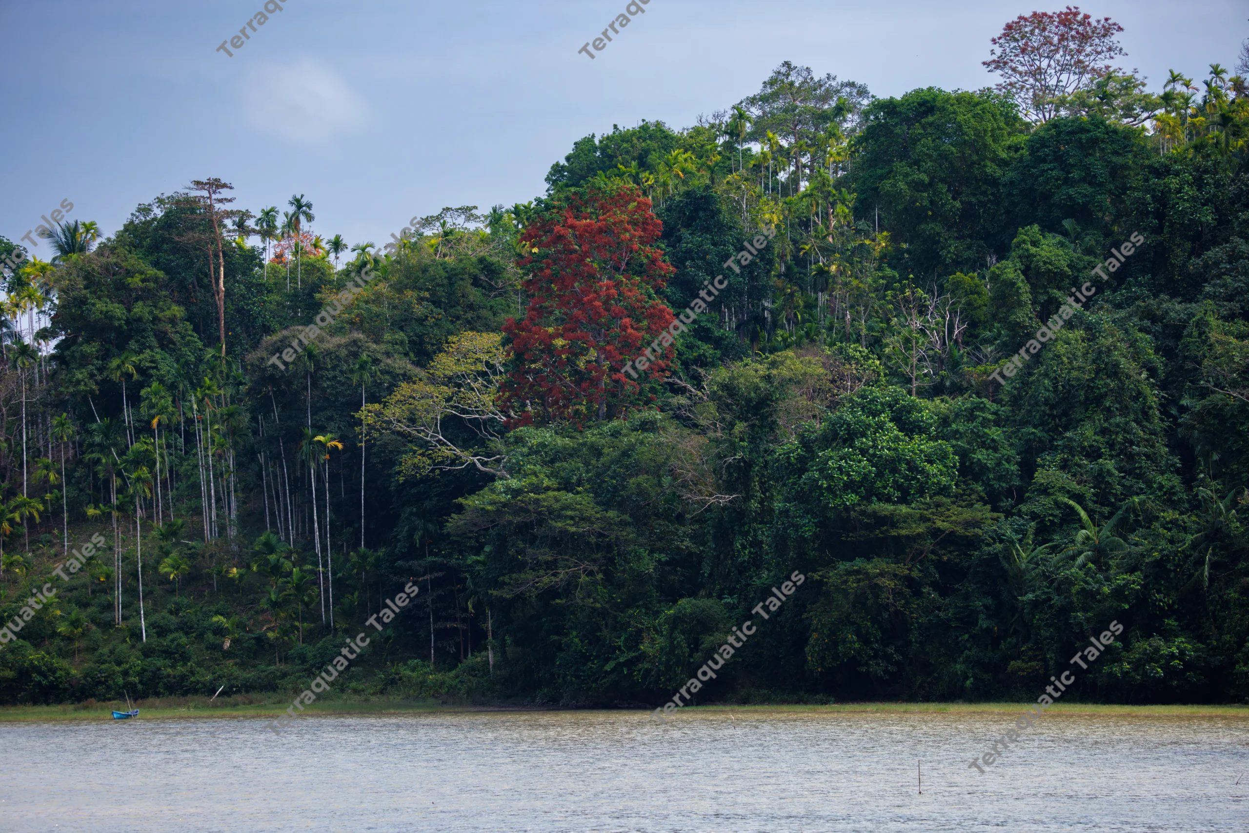 A picturesque landscape of the Andaman and Nicobar Islands, India, featuring a dense tropical forest meeting a calm body of water. A single, tall tree with striking red foliage stands as a focal point against the deep emerald green canopy and slender palm trees. The shot is taken from a low-angle water perspective under a soft, overcast sky, highlighting the serenity of the coastal ecosystem. Ideal for travel brochures, environmental blogs, or nature-themed website backgrounds.