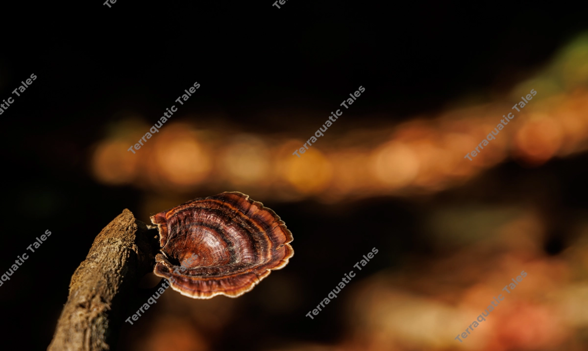 A detailed macro shot of a wild bracket fungus featuring distinct concentric rings of reddish-brown and copper. The fungus is attached to a weathered wooden branch, sharply focused against a dark, moody background with soft golden bokeh. Captured in the tropical rainforest of the Andaman and Nicobar Islands, this image highlights the intricate textures of forest decomposers. Ideal for scientific research, nature education, or as a high-contrast background for environmental conservation themes.