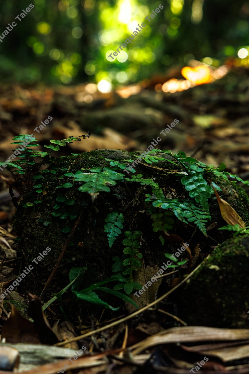 A low-angle, atmospheric macro shot of small, vibrant green ferns and moss colonizing a dark volcanic rock on the forest floor of Mount Harriet National Park. The image features a shallow depth of field, with the intricate details of the fern fronds in sharp focus against a soft, sun-dappled bokeh of the tropical jungle canopy in the background. This composition highlights the resilient beauty of undergrowth in the Andaman and Nicobar Islands and is ideal for botanical studies, environmental conservation materials, or serene nature-themed backgrounds.