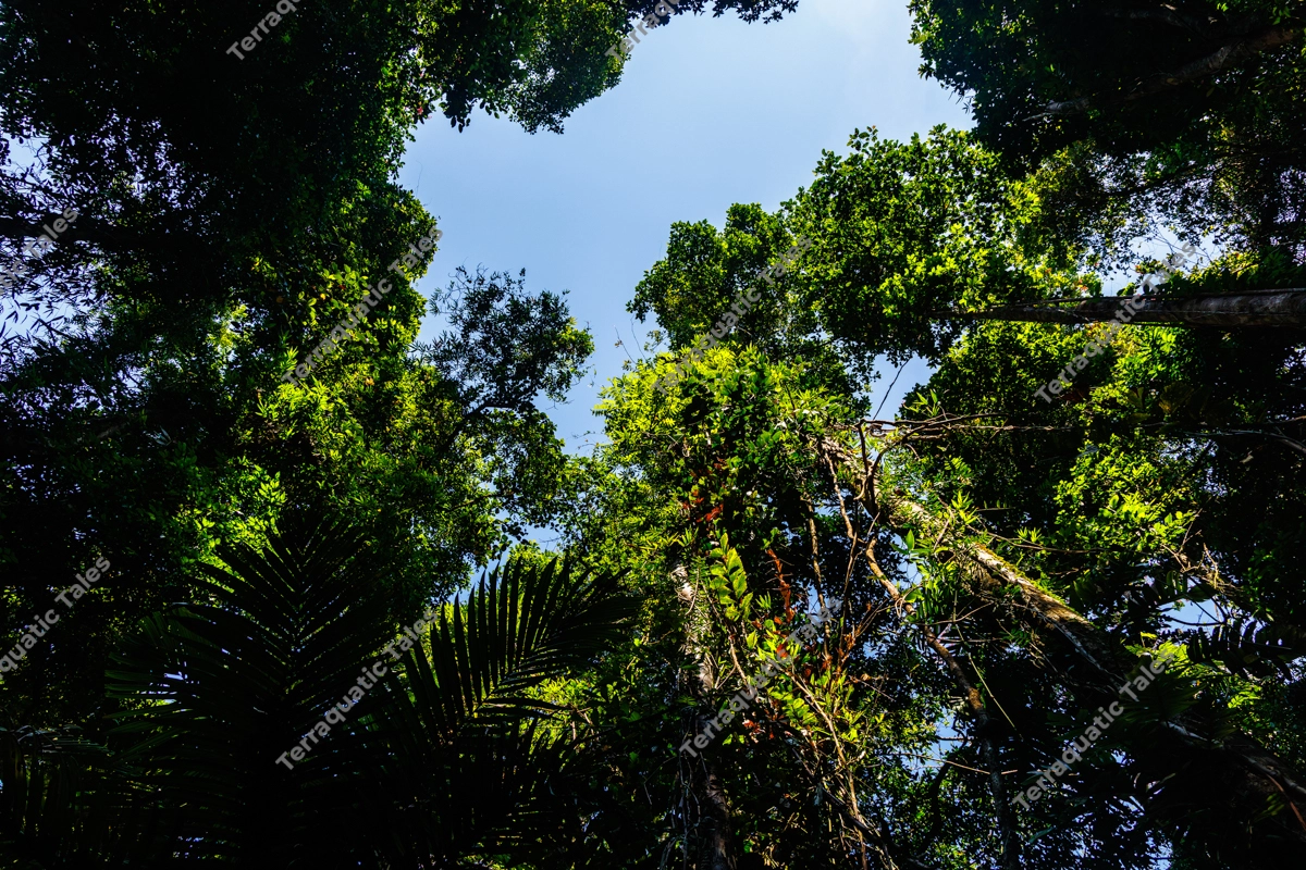 Low Angle View of Lush Rainforest Canopy and Blue Sky in Andaman