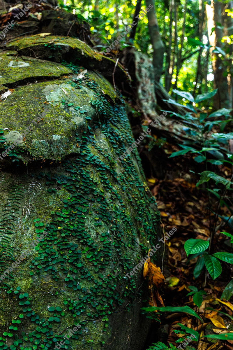 A low-angle, vertical shot emphasizes a massive boulder draped in vibrant green creepers and moss within the dense jungles of the Andaman and Nicobar Islands. The forest floor is visible in the background, covered in fallen brown leaves and dappled sunlight, creating a deep sense of immersion. This high-contrast image captures the untouched beauty of the Indian archipelago’s interior. It is perfect for travel guides, environmental awareness campaigns, or as a high-quality nature background.