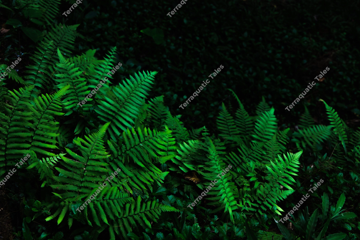 A horizontal close-up captures vibrant green fern fronds flourishing in the deep shade of the Mount Harriet National Park (Mount Manipur National Park) rainforest. The sharp detail of the serrated leaves contrasts against the dark, moody shadows of the Andaman jungle floor. This botanical image showcases the rich biodiversity of the Indian archipelago. It is perfect for nature conservation websites, botanical educational materials, tropical-themed interior decor, or wellness backgrounds.
