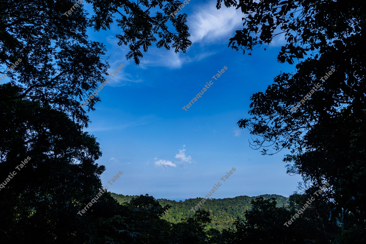A stunning wide-angle landscape captures a vibrant blue sky framed by the dark, silhouetted silhouettes of tropical tree branches. In the distance, rolling green hills of a dense rainforest stretch toward the horizon under a clear day. This peaceful scene was captured in the Andaman and Nicobar Islands, India. It is an ideal background for travel websites, environmental blogs, or wellness advertisements focusing on serenity and the beauty of the natural world.
