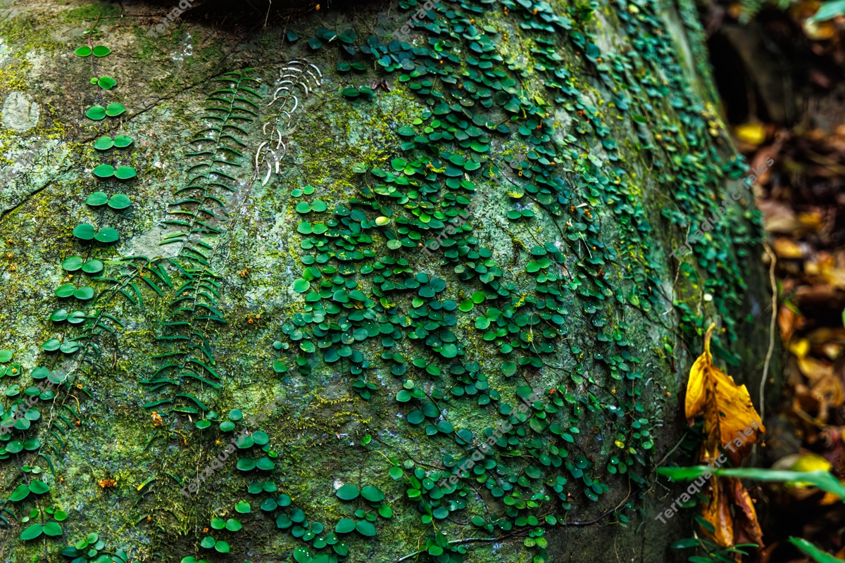 Macro of Tiny Creepers and Ferns on Mossy Rock in Andaman Rainforest