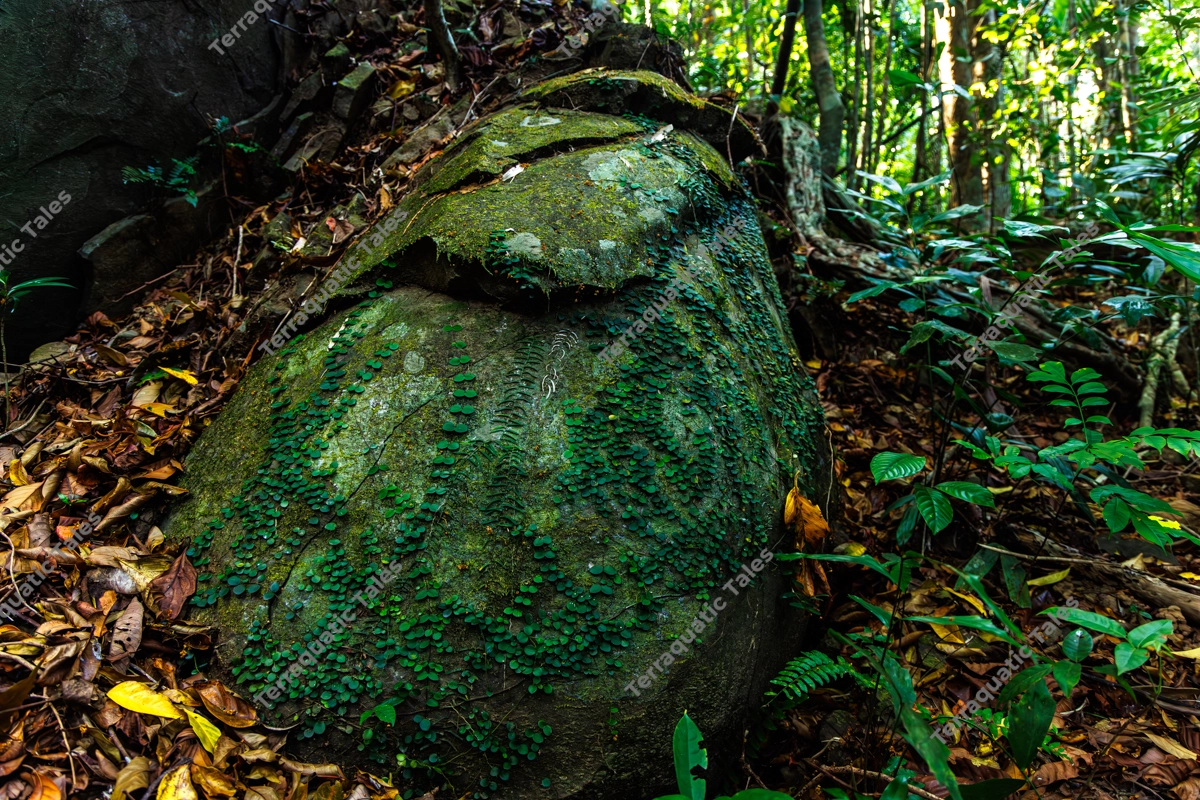 A wide-angle shot features a large, ancient boulder covered in velvet-green moss and delicate climbing vines deep within the Andaman and Nicobar Islands. The forest floor is carpeted with dry autumn-colored leaves, contrasting with the vibrant green flora. Soft, diffused light filters through the dense canopy, creating a moody and primordial atmosphere. This image is perfect for environmental conservation campaigns, nature-themed website backgrounds, or travel editorial pieces on India.