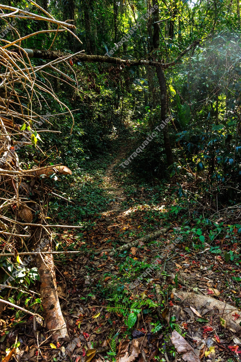 A narrow, sun-dappled trekking trail cuts through the lush undergrowth of a tropical rainforest. The scene features a mix of green ferns, dry leaf litter, and fallen branches, creating a rugged and authentic wilderness atmosphere. This vertical composition highlights the dense layers of the Andaman Islands’ ecosystem. Ideal for adventure travel guides, environmental documentaries, hiking blogs, or nature-themed website backgrounds.