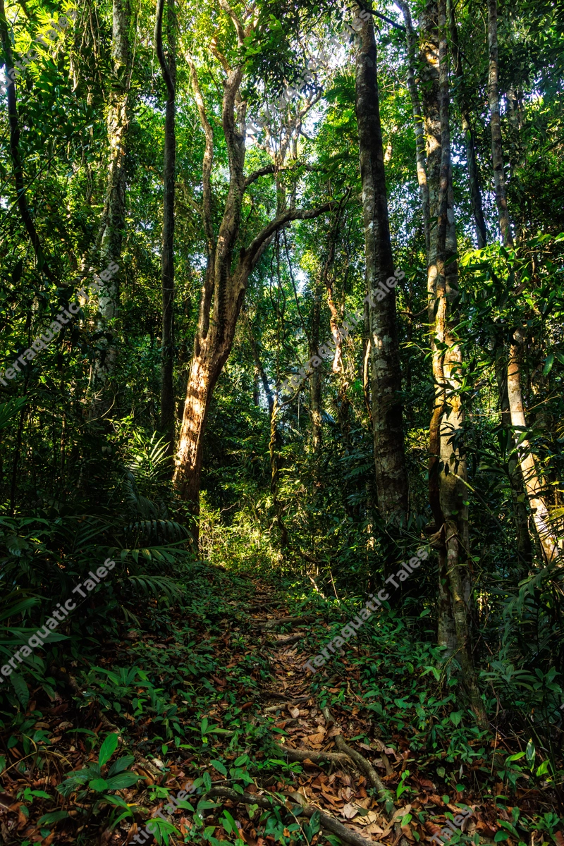 A vertical landscape of a narrow trekking path winding through a lush tropical rainforest. Vibrant green foliage and tall tree trunks are illuminated by patches of golden sunlight piercing through the dense canopy. The forest floor is covered in a natural layer of dry leaves and tangled roots. This image captures the serene yet wild atmosphere of the Andaman and Nicobar Islands. Ideal for travel brochures, environmental conservation projects, and nature-themed backgrounds.