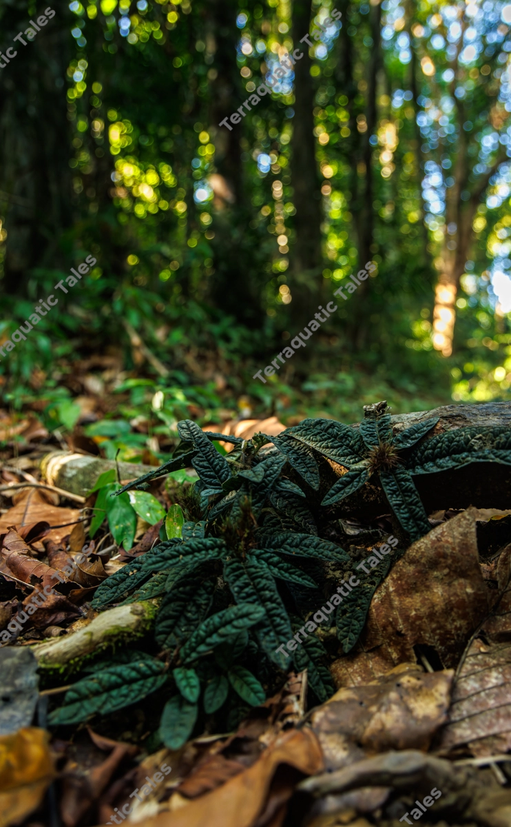 A vertical close-up of dark green, textured forest floor plants thriving amidst fallen brown leaves and decaying wood. The background shows a lush, sun-dappled jungle with soft bokeh, capturing the quiet atmosphere of the Andaman and Nicobar Islands’ wilderness. This image is ideal for nature-themed backgrounds, environmental conservation campaigns, botanical studies, or travel brochures highlighting tropical biodiversity.