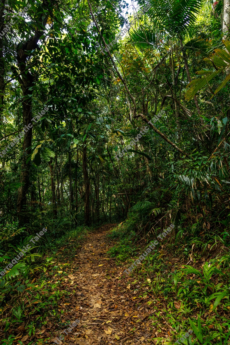 A vertical perspective of a winding dirt path covered in fallen leaves, leading deep into the lush tropical rainforest of Mount Harriet National Park, Andaman Islands. The scene is surrounded by dense green foliage, towering trees, and wild palms under a filtered canopy. This serene forest landscape is ideal for travel blogs, environmental conservation websites, trekking guides, and nature-themed editorial content.