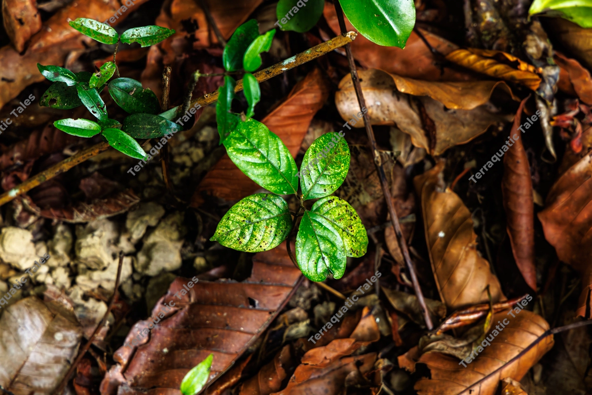 A top-down macro view of a young green sapling growing through a thick layer of brown, decaying tropical leaves on the forest floor of Mount Harriet National Park. The image highlights the contrast between new life and organic decomposition in the Andaman rainforest.