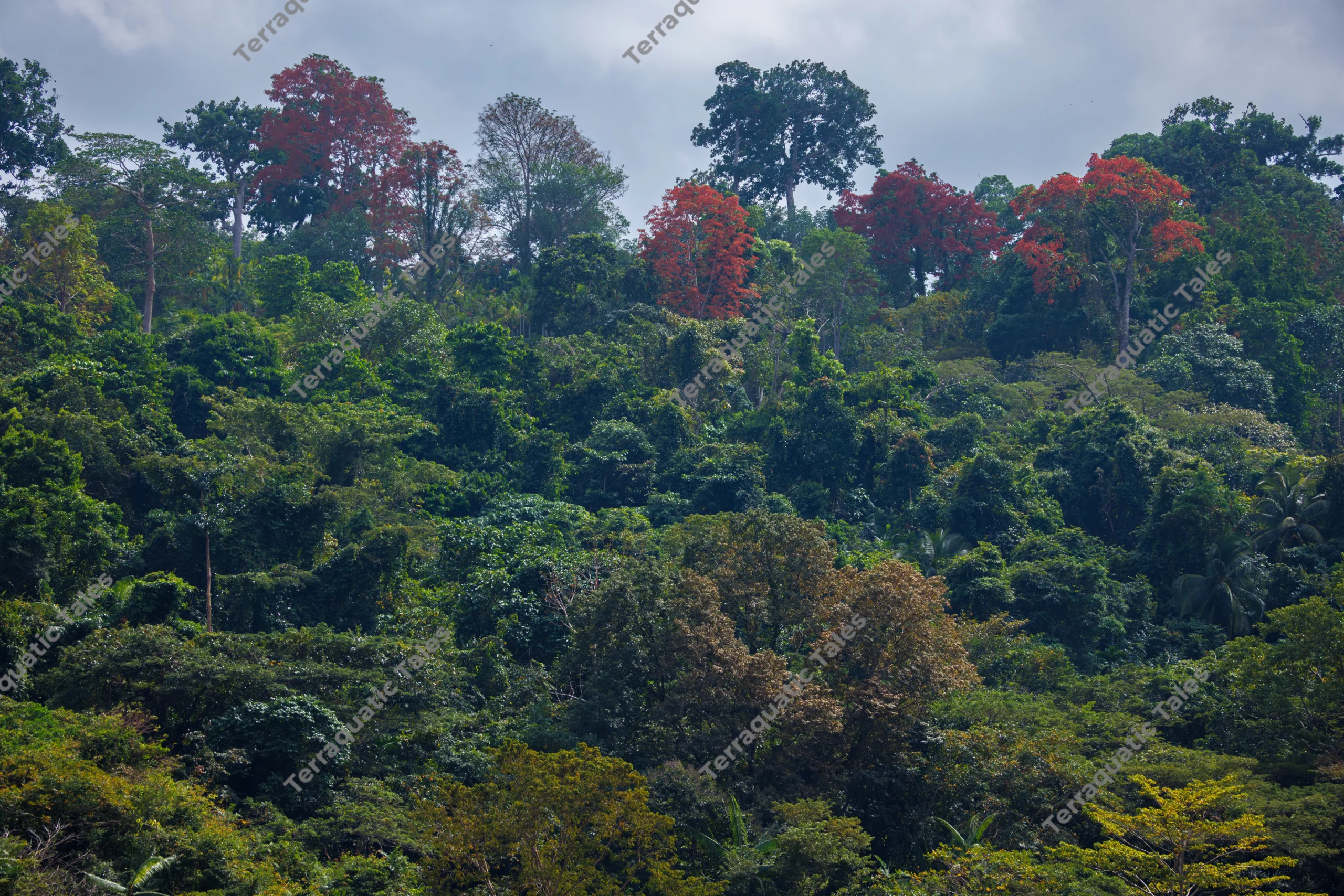 Vibrant Red Trees in Lush Andaman Island Rainforest Canopy
