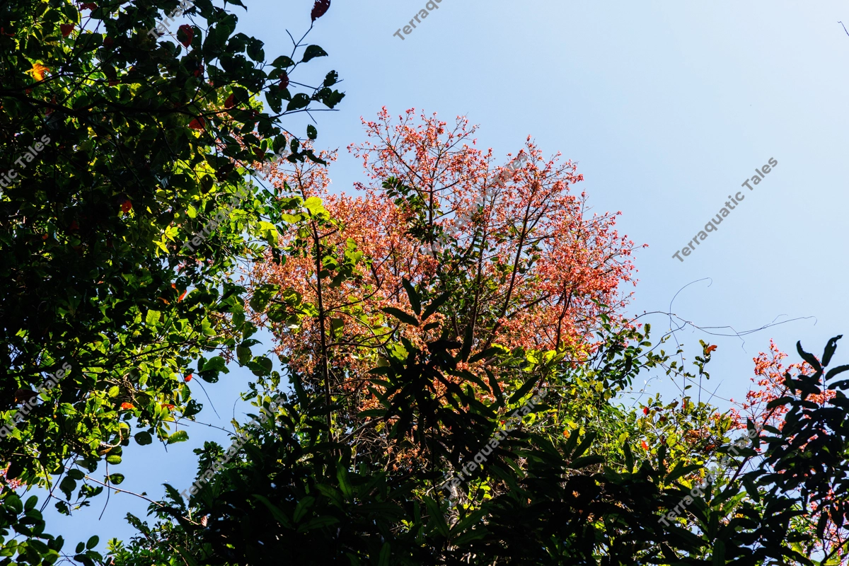 A striking low-angle perspective looking up through the lush layers of a tropical rainforest canopy in Mount Harriet National Park, Andaman Islands. The image features a central tree bursting with vivid red autumn-like foliage, creating a bold color contrast against the deep green silhouettes of surrounding palms and a crisp, clear blue sky. This high-contrast natural composition highlights the unique seasonal transitions and biodiversity of the Indian archipelago. It is an ideal choice for environmental editorial content, travel brochures, and nature-themed digital backgrounds.