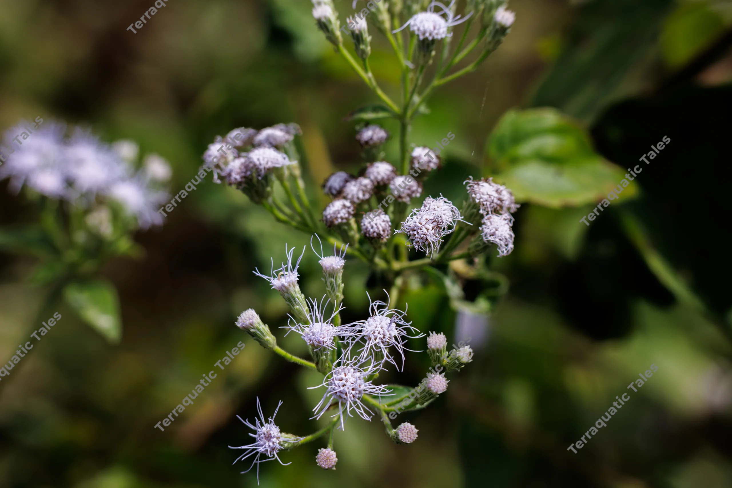 A professional macro photograph of Chromolaena odorata, also known as Siam Weed or Devil Weed, captured in the Andaman and Nicobar Islands, India. The image showcases the intricate, feathery white and pale purple tubular florets and green bracts in sharp focus. The shallow depth of field creates a beautiful soft bokeh background, emphasizing the plant’s delicate structure. This high-quality botanical image is ideal for educational textbooks, invasive species studies, or pharmaceutical research contexts.
